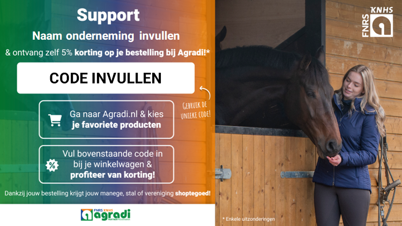 Agradi heeft een nieuw Partnerprogramma voor FNRS en KNHS aanbieders. Wij als FNRS manege mogen gebruik maken van een eigen, unieke kortingscode bij Agradi & deze code mogen jullie als lid van Manege Zwanenburg gebruiken! Met de kortingscode kunnen jullie 10% korting krijgen op je bestelling bij Agradi. Wij mogen de kortingscode niet openbaar delen op onze website. Maar wil jij gebruik maken van de kortingscode, stuur ons dan een mail, berichtje of vraag het aan ons!